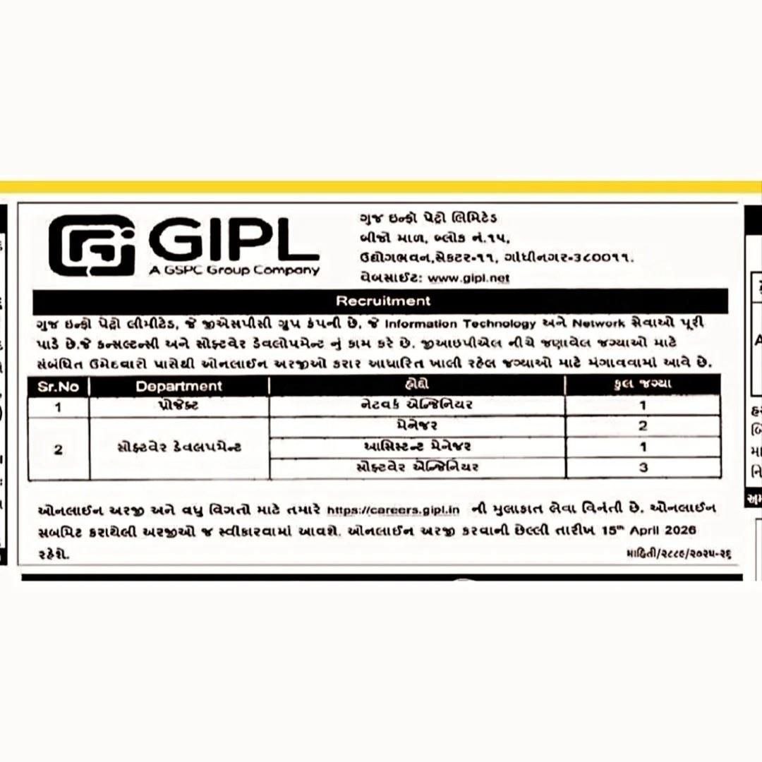 Guj Info Petro Limited (GIPL), which is a part of the prestigious GSPC Group, has released a new recruitment notification for various IT and technical roles. This hiring drive is aimed at filling 7 contractual vacancies in Gandhinagar.