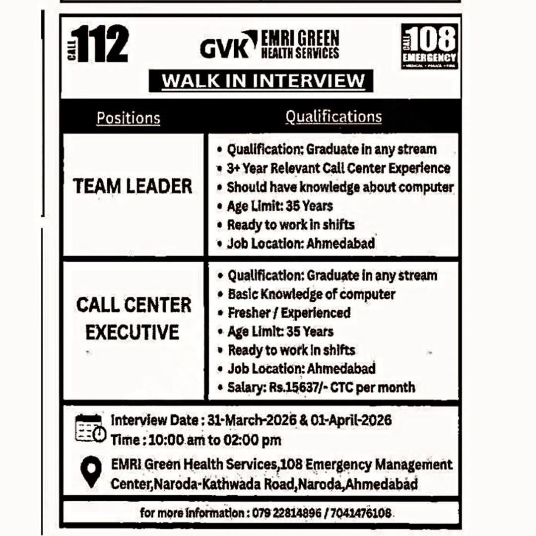 GVK EMRI Ahmedabad Recruitment 2026 walk-in interview for Team Leader and Call Center Executive posts. Check eligibility, salary, and interview dates.