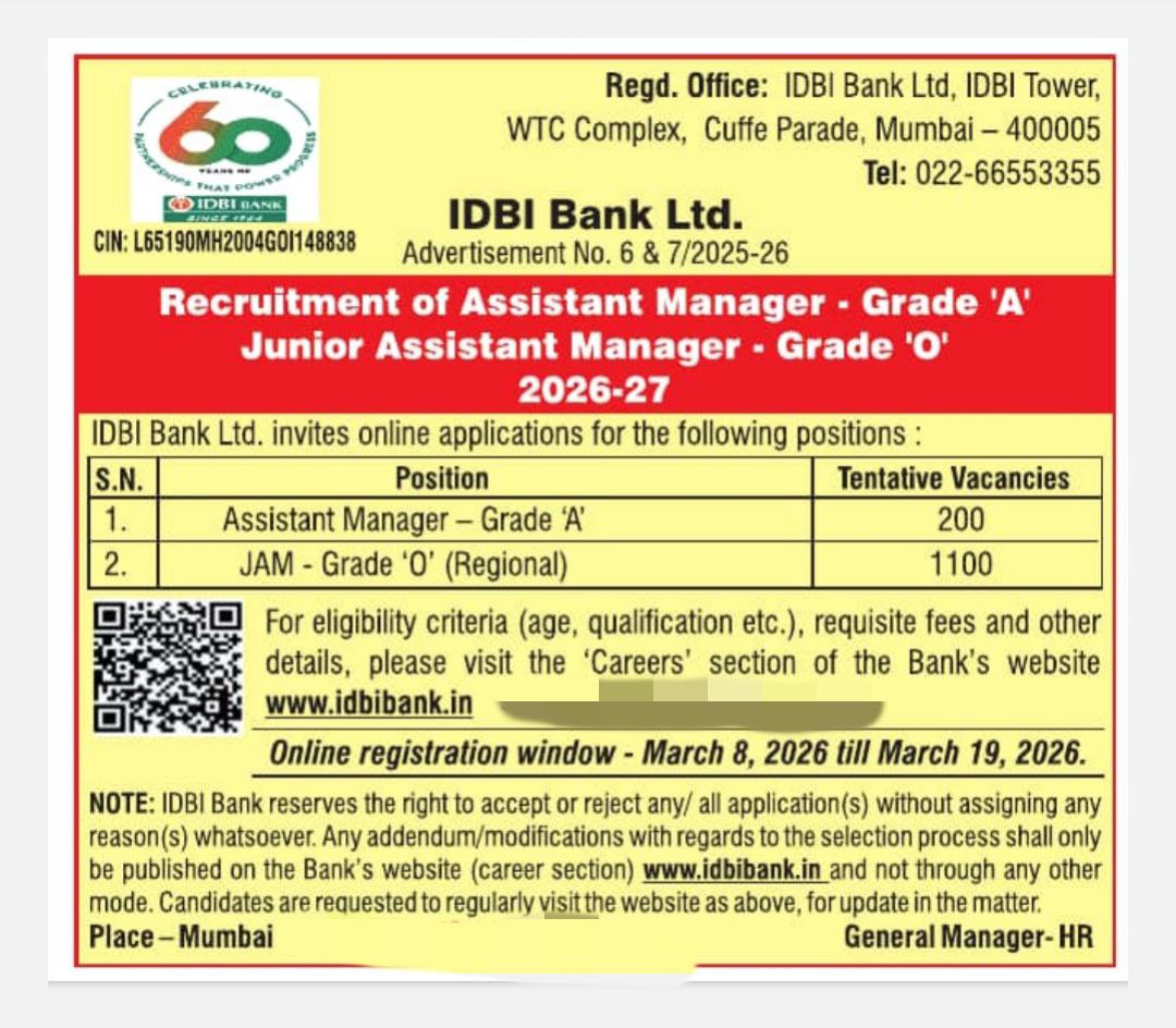 IDBI Bank Ltd. has officially released recruitment advertisements No. 6 & 7/2025-26 inviting applications for Assistant Manager (Grade ‘A’) and Junior Assistant Manager – JAM (Grade ‘O’) positions for the recruitment year 2026-27.