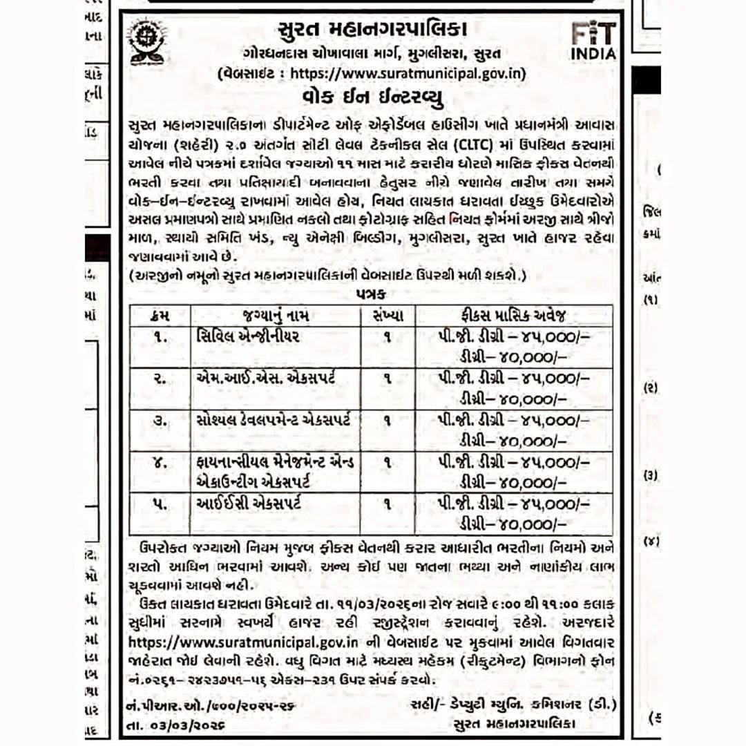 Surat Municipal Corporation (SMC) has released a recruitment notification for several professional positions under the City Level Technical Cell (CLTC) of the Department of Affordable Housing. The recruitment is being conducted as part of the Pradhan Mantri Awas Yojana (Urban) 2.0 initiative.